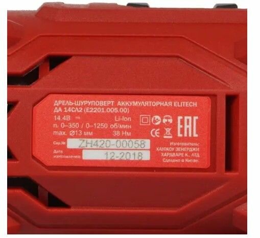 Дрель акк ELITECH ДА 14СЛ2 (14,4В,2 акк*4.0Ач,Li-ion,БЗП-13мм,38Нм,кейс,подсветка,инд.зар) информация: