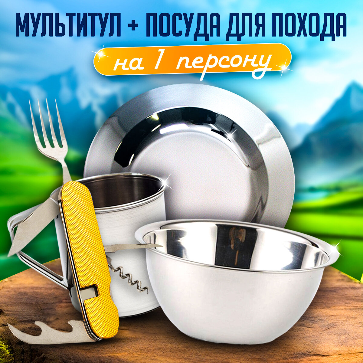 Набор туристической посуды, посуда туристическая для похода, кемпинга, подарок для туриста, 5 предметов, нерж.сталь 714 ₽