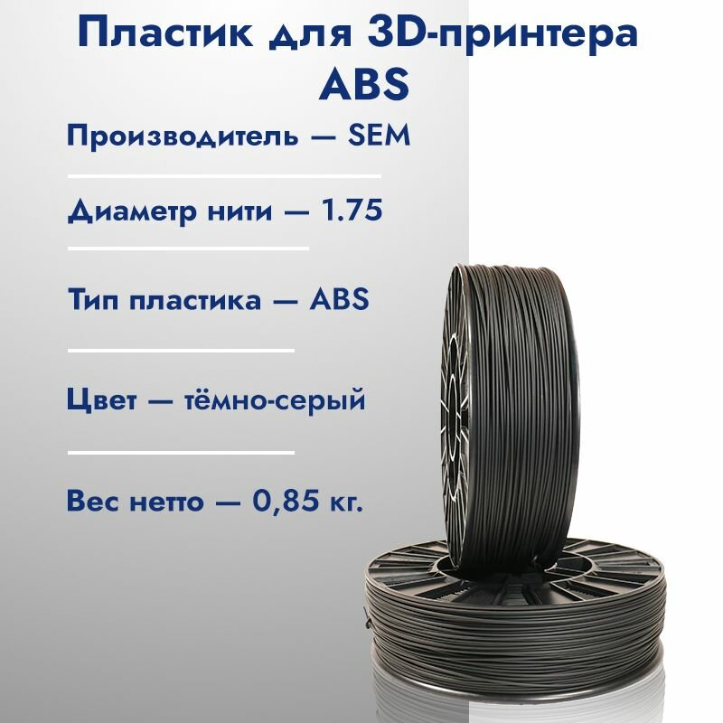 Катушка ABS пластика для 3D принтера SEM 1,75 Тёмно-серый 1кг информация: