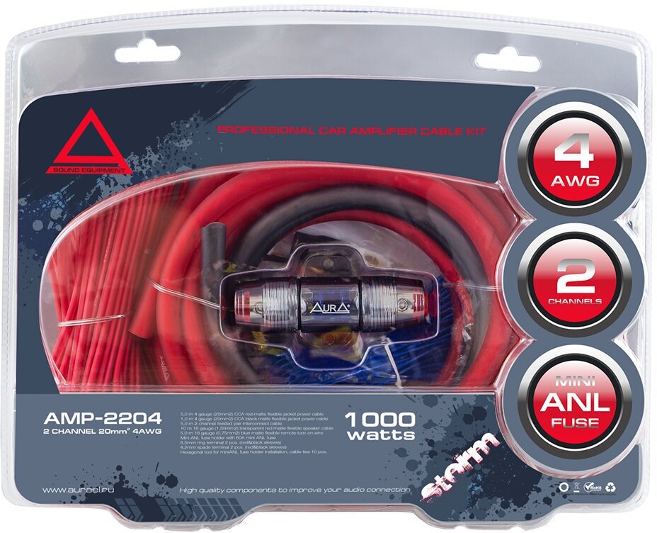 | Комплектация | силовой кабель 8AWG (8мм2) красный - 5 метров, силовой кабель 8AWG (8мм2) черный -1 метр, колба MiniANL + предохранитель 60A, RCA-кабель: 5 метров, 4 канала, витая пара (RCA-A154 MkII), акустический кабель 16AWG (2×1,5мм2) -15 метров, провод «remote» 18AWG (0.75мм2) синий -5 метров, клемма кольцевая для силового кабеля сечением 8AWG (8мм2): 2 шт., клемма U-образная для силового кабеля сечением 8AWG (8мм2): 2 шт., шестигранник, стяжки -10шт. |
