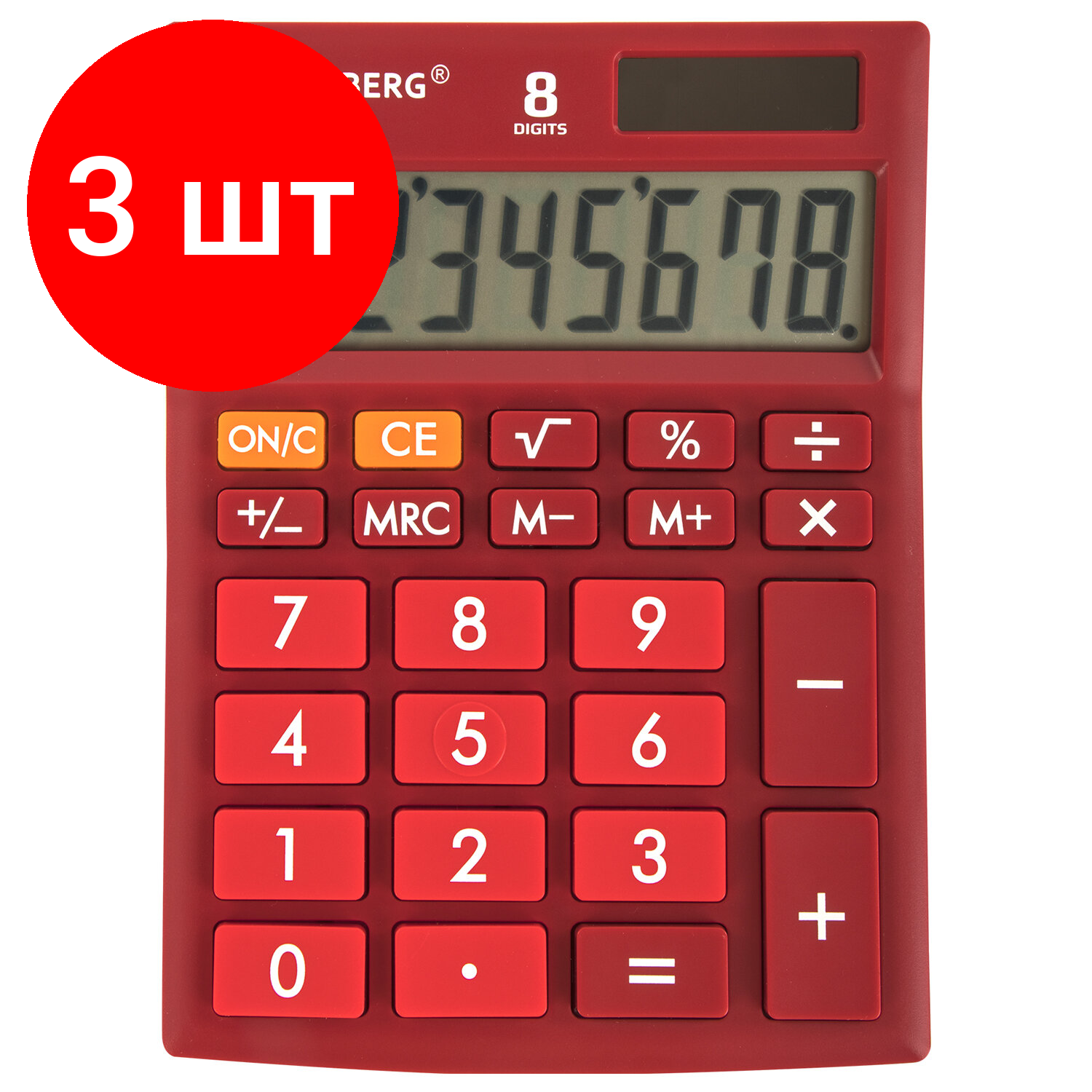 10 цен на Комплект 3 шт, Калькулятор настольный BRAUBERG ULTRA-08-WR, компактный (154x115 мм), 8 разрядов, двойное питание, бордовый, 250510