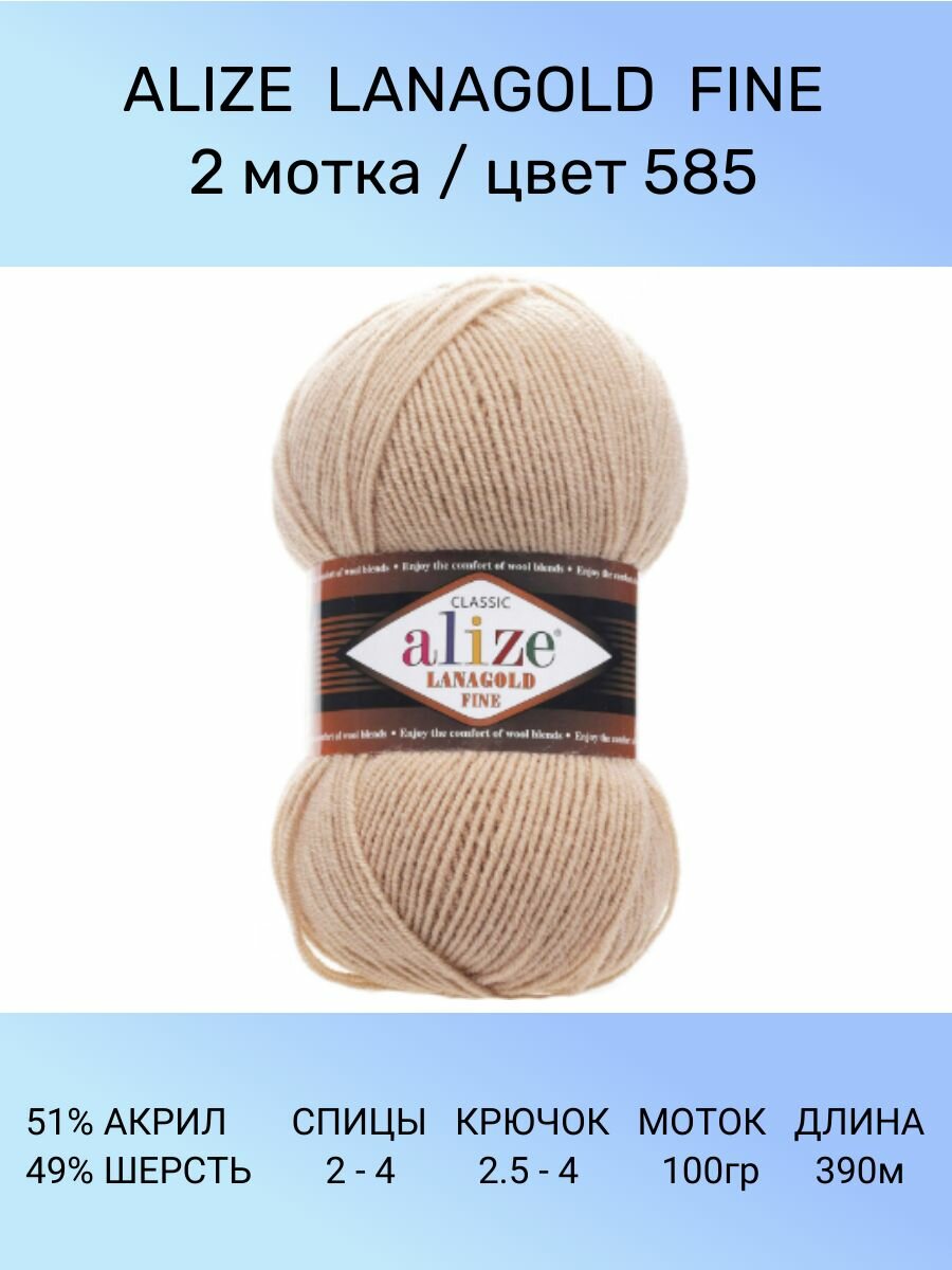 Пряжа Alize Lanagold Fine (Ализе Ланаголд Файн) - 2 мотка, 05 бежевый, 49% шерсть, 51% акрил 390м/100г