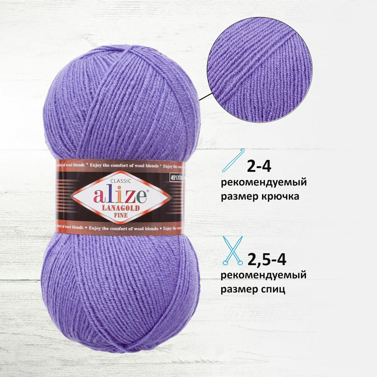 Пряжа для вязания ALIZE LANAGOLD FINE: 166 (лиловый), 5 шт 390 м 100 г, 49% шерсть 51% акрил