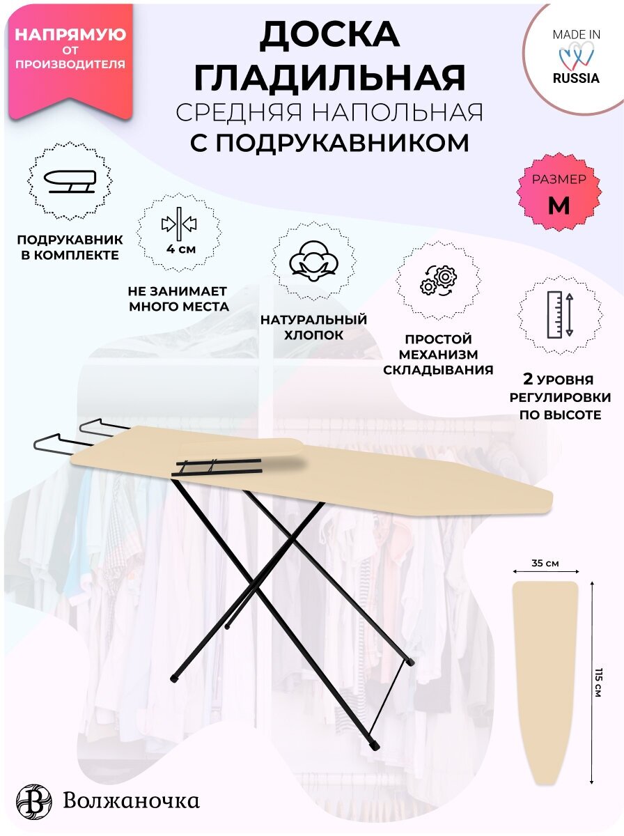 10 цен на Волжаночка Гладильная доска напольная с подрукавником и подставкой для утюга, размер 115х35 см., цвет слоновая кость