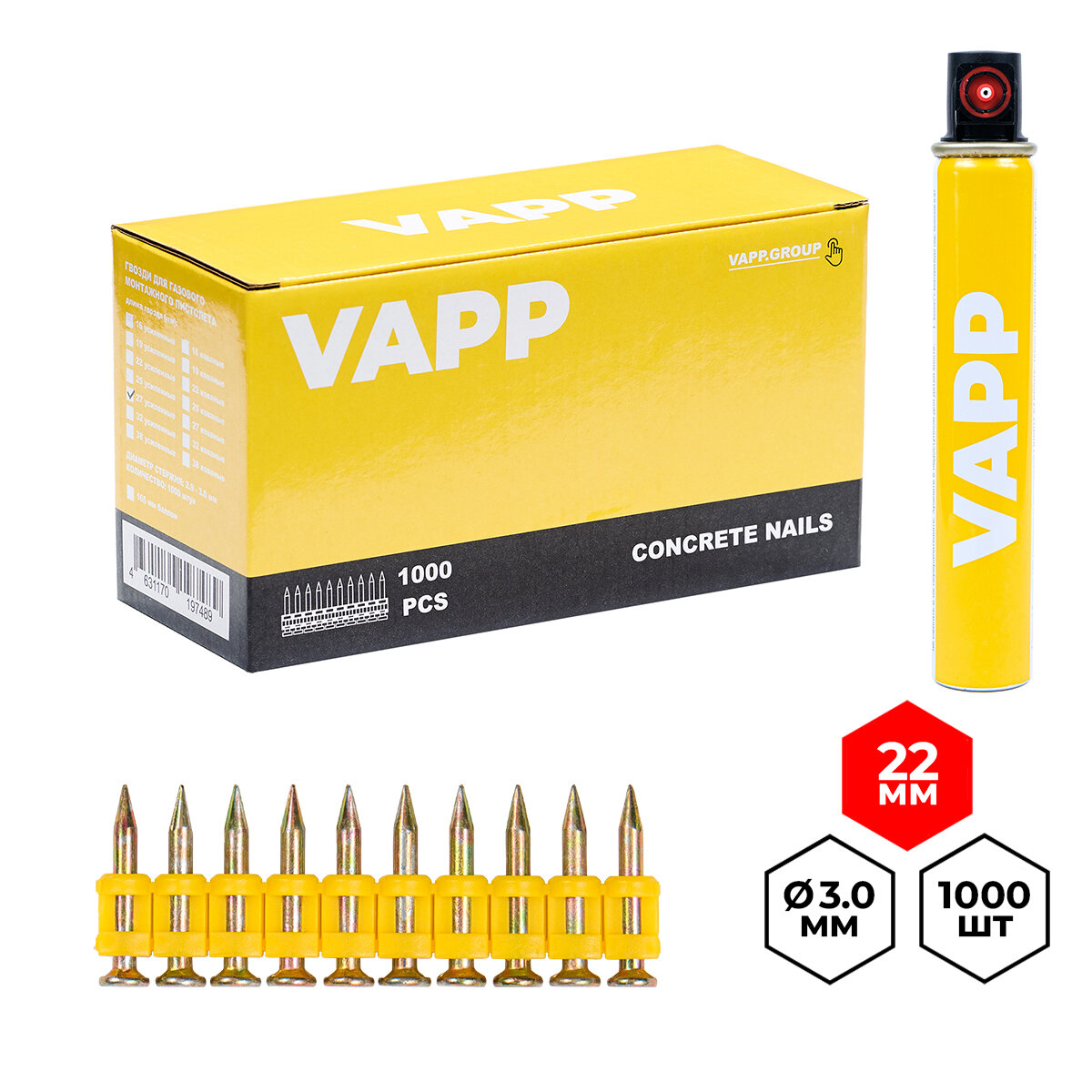 Гвозди усиленные VAPP 3*22 мм для газового монтажного пистолета и газовый баллон 165 мм информация: