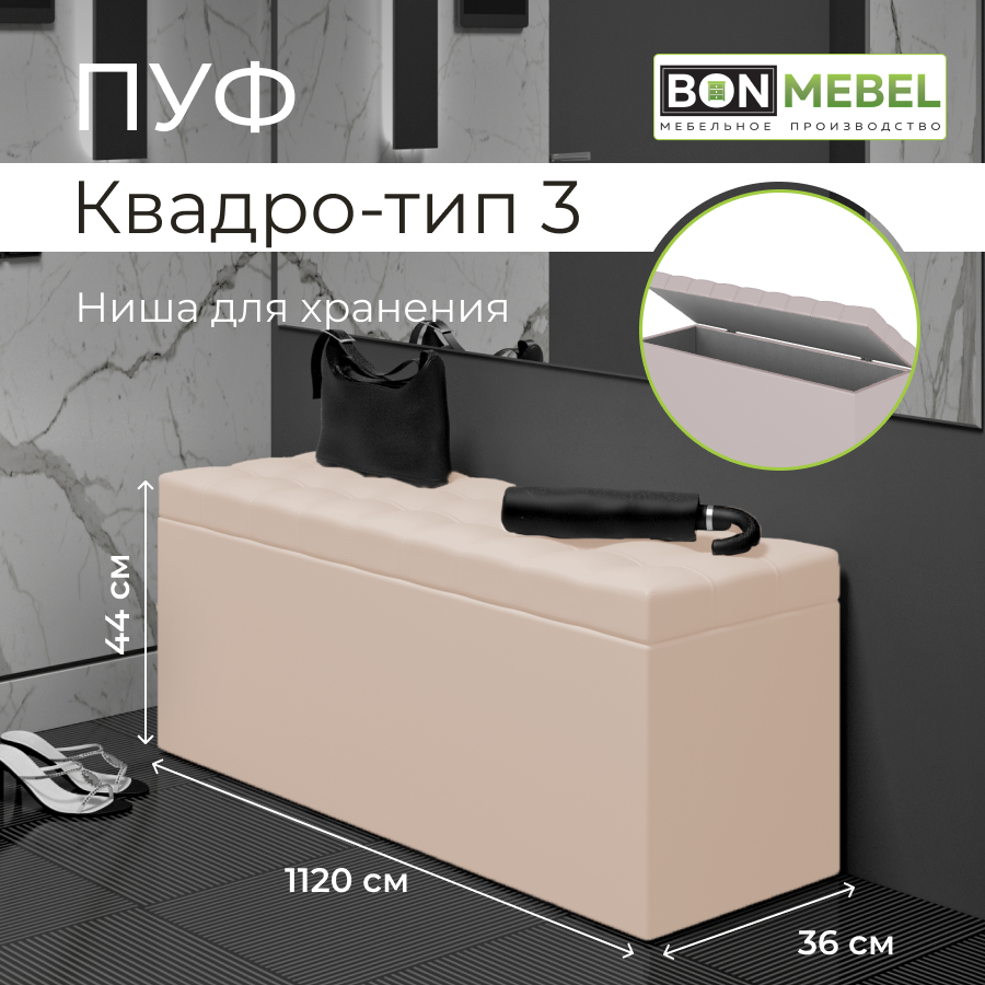 10 цен на Пуфик БонМебель Квадро 3, бежевый, 112х36х44, пуф с ящиком для хранения, экокожа, пуфик в прихожую, мебель