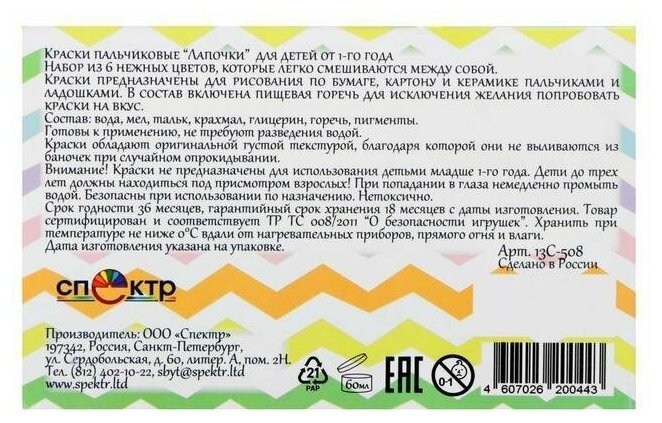 Краски пальчиковые набор 6 цветов х 60 мл, Спектр, 360 мл, "Лапочки" (от 1 года ) информация: