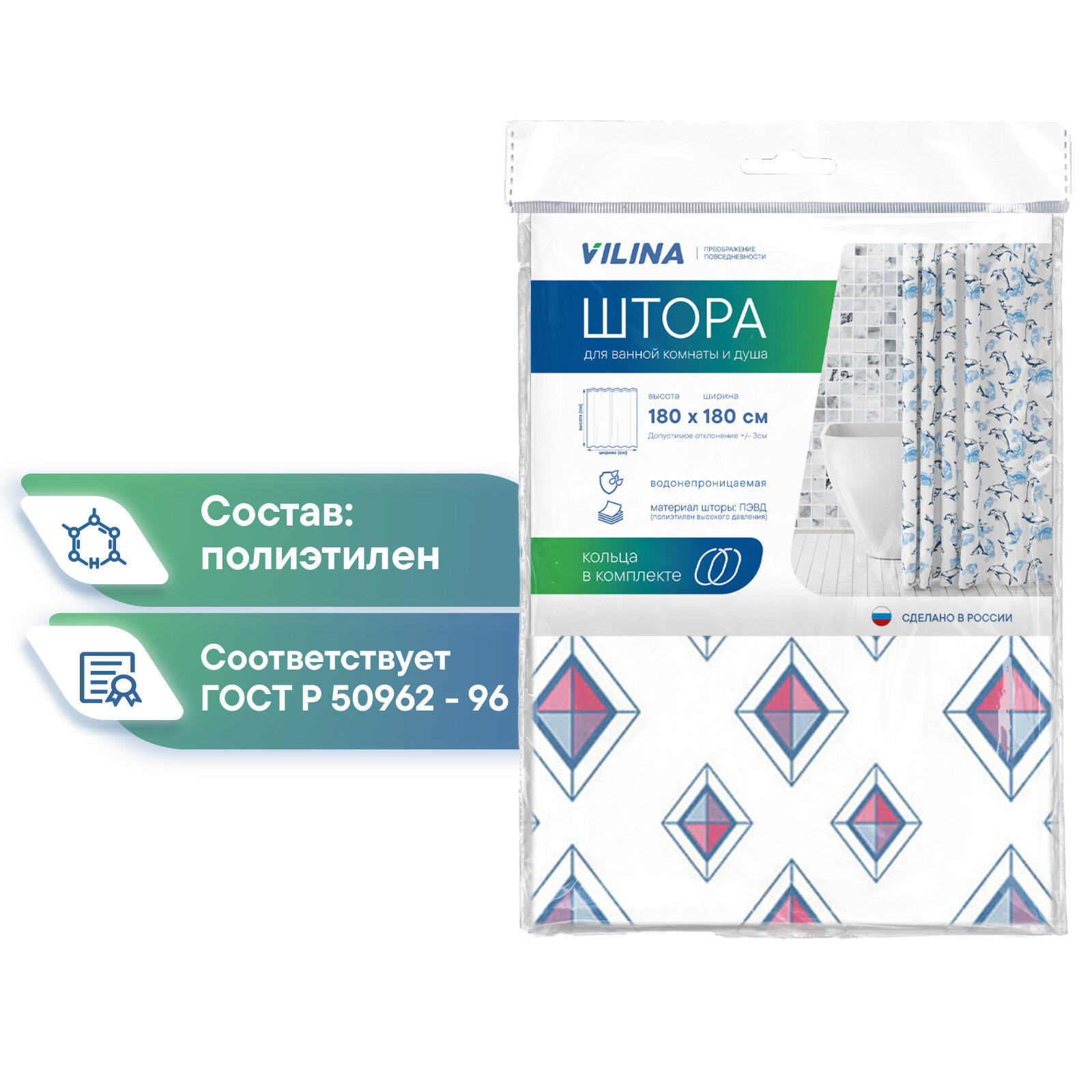 Отзывы на Штора для ванной комнаты VILINA водонепроницаемая с рисунком занавес с кольцами 180х180 см Диамант белая