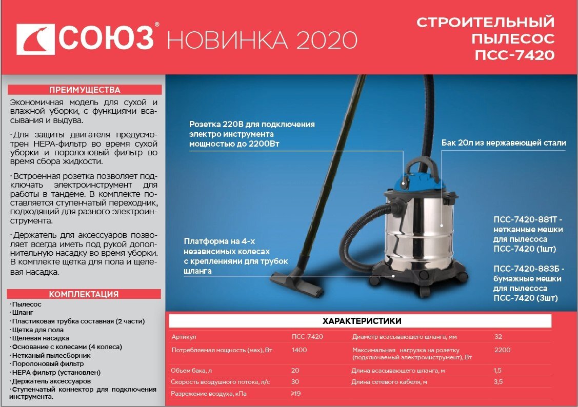 Пылесос промышленный СОЮЗ ПСС-7420 /1400Вт, объем 20л, электр.розетка информация: