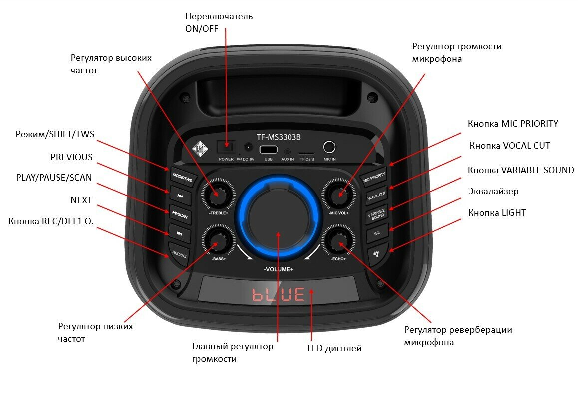 Портативная колонка Telefunken TF-MS3303, 90 Вт, 5000 мАч, TWS, AUX, FM, дисплей, подсветка 14 264 ₽