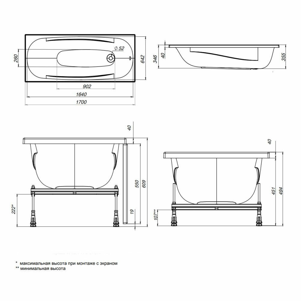 Ванна Gamma 140х70 см, акриловая, на каркасе, экран к ванне Gamma 140