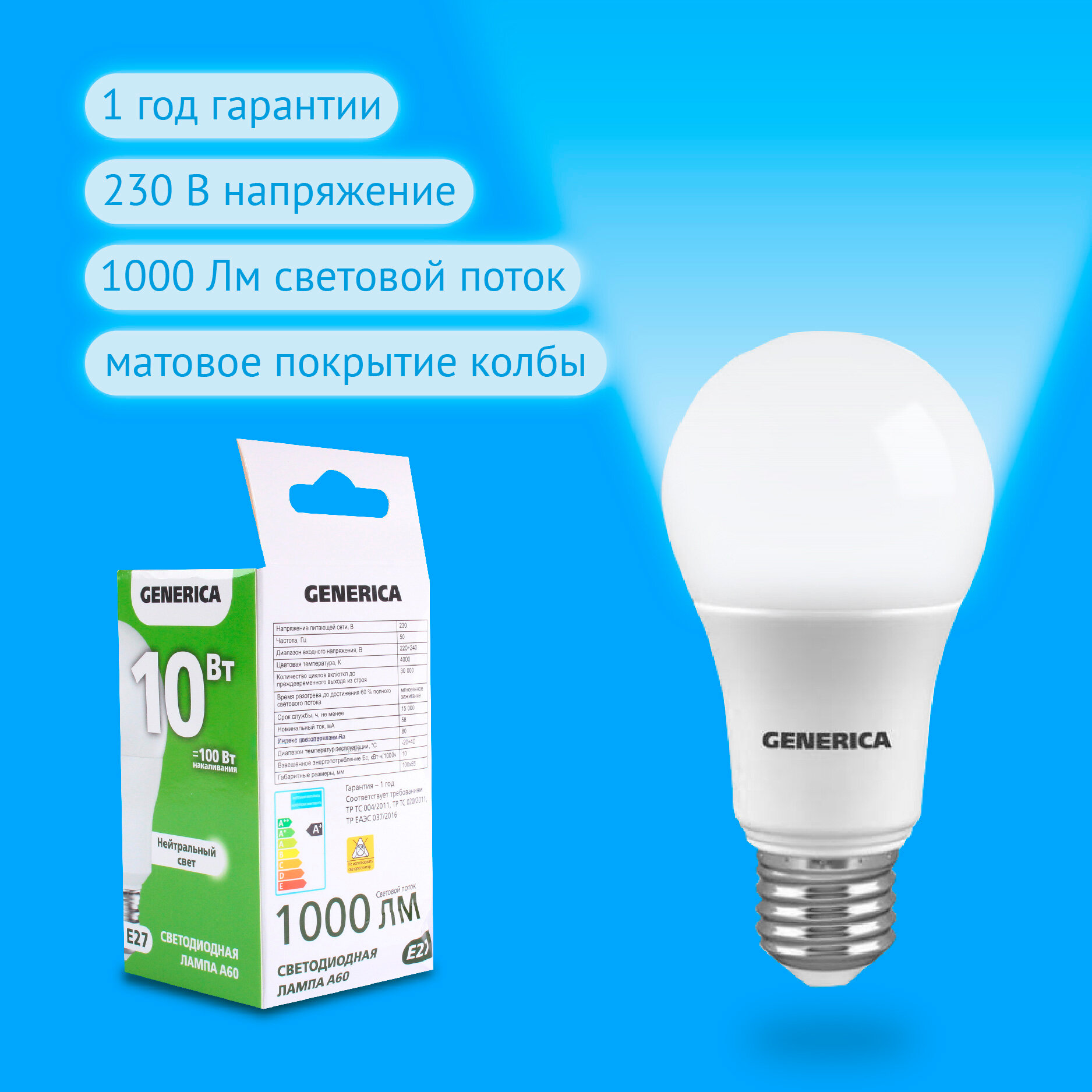 GENERICA ЛОН A60 E27 10W(1000lm) 4000K 4K 55x100 матов. LL-A60-10-230-40-E27-G (арт. 827958)