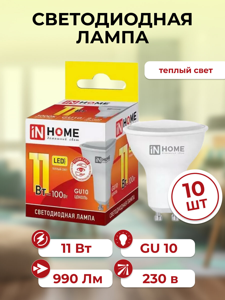 Лампа светодиодная LED-JCDRC-VC INHOME 11Вт, GU10, 990Лм, 3000К, теплый белый свет, 10 шт информация: