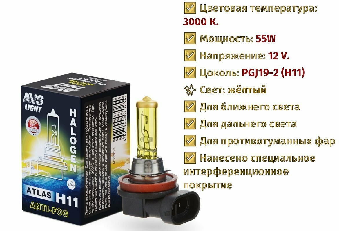 Галогенная лампа AVS ATLAS ANTI-FOG BOX желтый H11.12V.55W.ко информация: