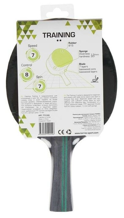 TORRES Ракетка для настольного тенниса Torres Training, 2 звезды, накладка 1.5 мм, коническая ручка информация: