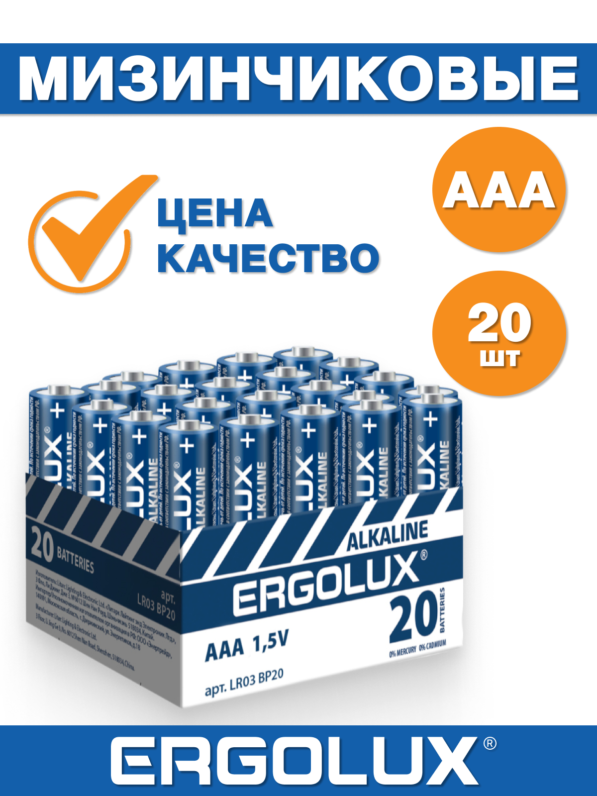 Ergolux Alkaline BP20 LR03 (промо, LR03 BP20, мизинчиковая батарейка ААА 1.5В) (упак. 20 шт.), цена за 1 упак.