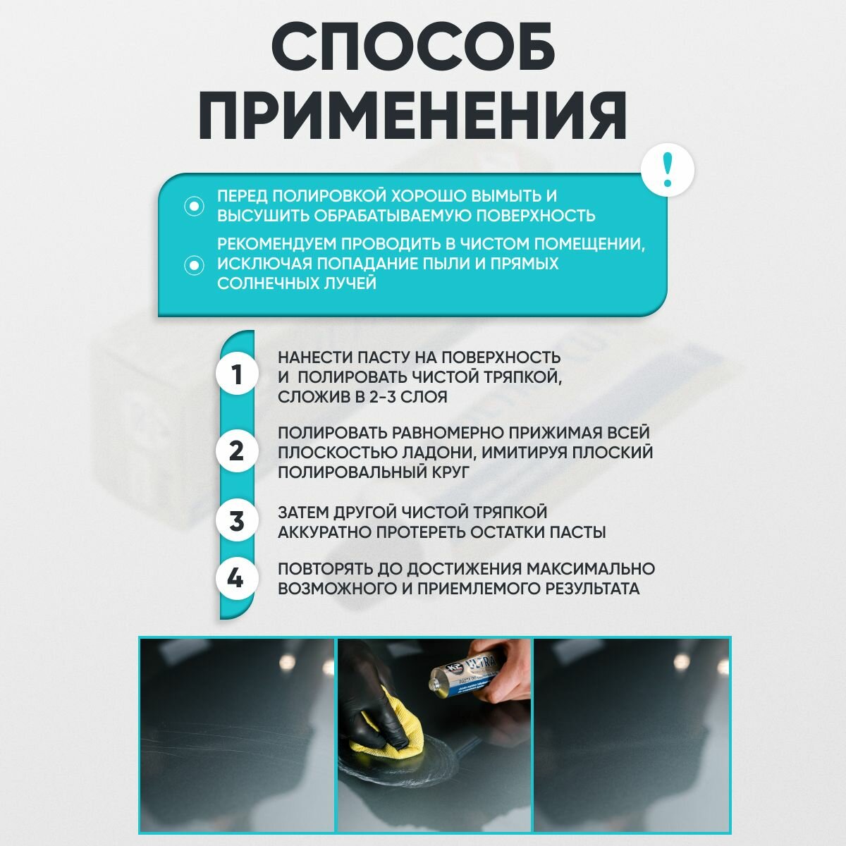 | Способ применения | Полировать желательно в ЧИСТОМ помещении, исключая пыль, попадание прямых солнечных лучей. После нанесения полировать НОВОЙ, ЧИСТОЙ, МЯГКОЙ салфеткой из микрофибры круговыми движениями, сложив в 2-3 слоя, равномерно прижимая всей плоскостью ладони, имитируя плоский полировальный круг. Затем другой чистой микрофиброй аккуратно протереть остатки пасты. Повторять до достижения максимально возможного и приемлемого результата. |