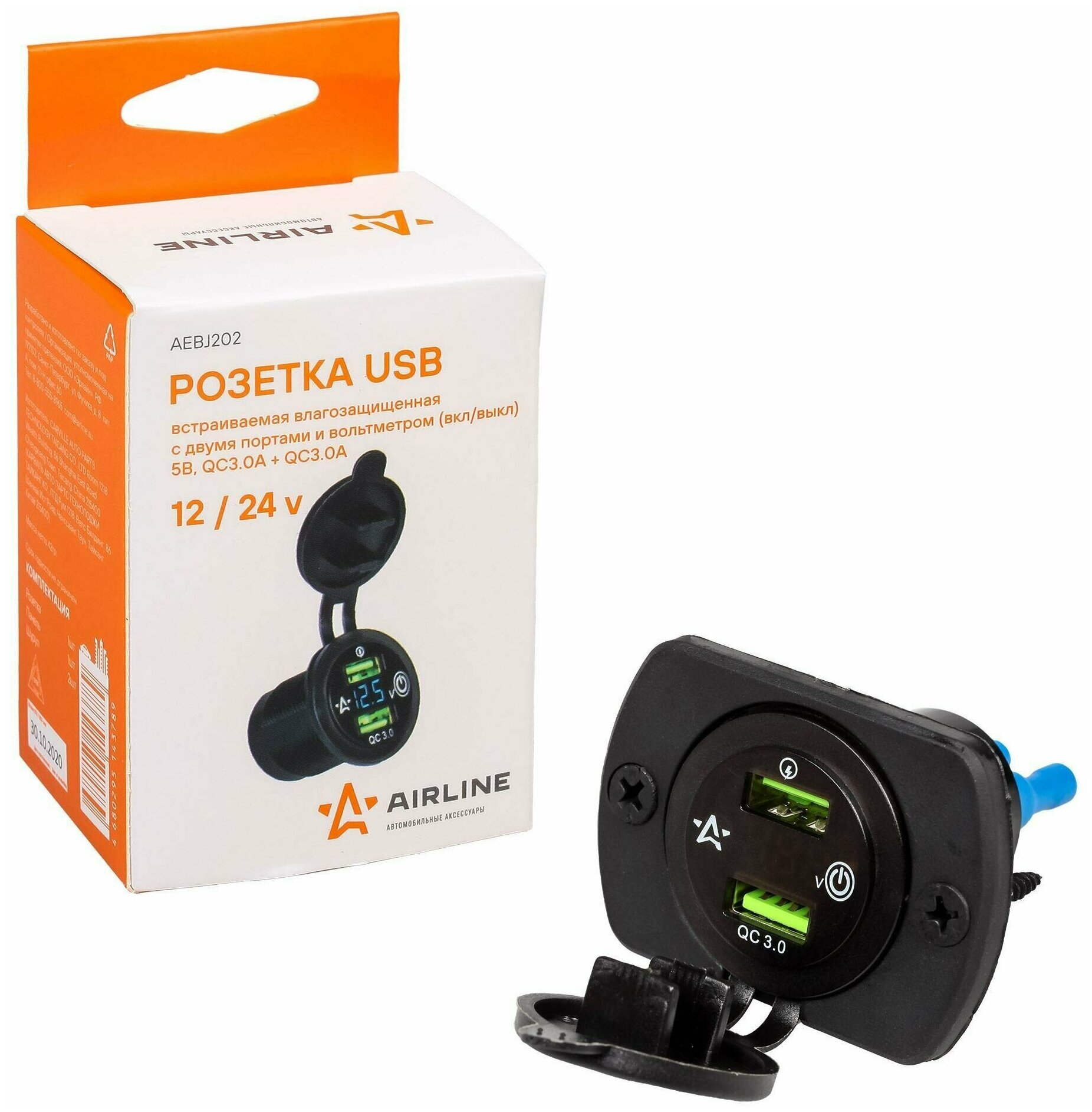 Розетка Автомобильная "Airline" (Usb Встраиваемая Влагозащитная, 2 Порта, Вольтметр (5В, Qc3.0+Qc3.0)) AIRLINE арт. AEBJ202