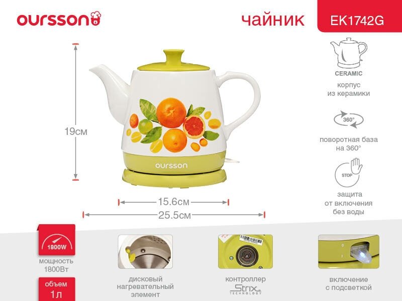 Электрический чайник Oursson KE1742G/GA, 1.8 кВт, керамика, зеленое яблоко 3 290 ₽