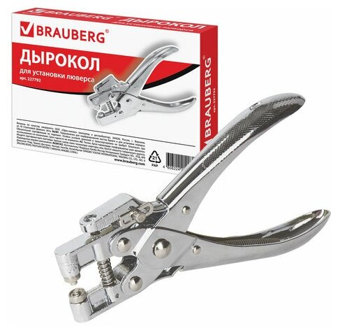 Дырокол BRAUBERG на 1 отверстие, для установки люверса, до 30 л, диаметр отверстия 5 мм, хром