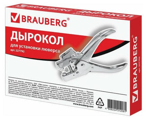 Дырокол BRAUBERG на 1 отверстие, для установки люверса, до 30 л, диаметр отверстия 5 мм, хром