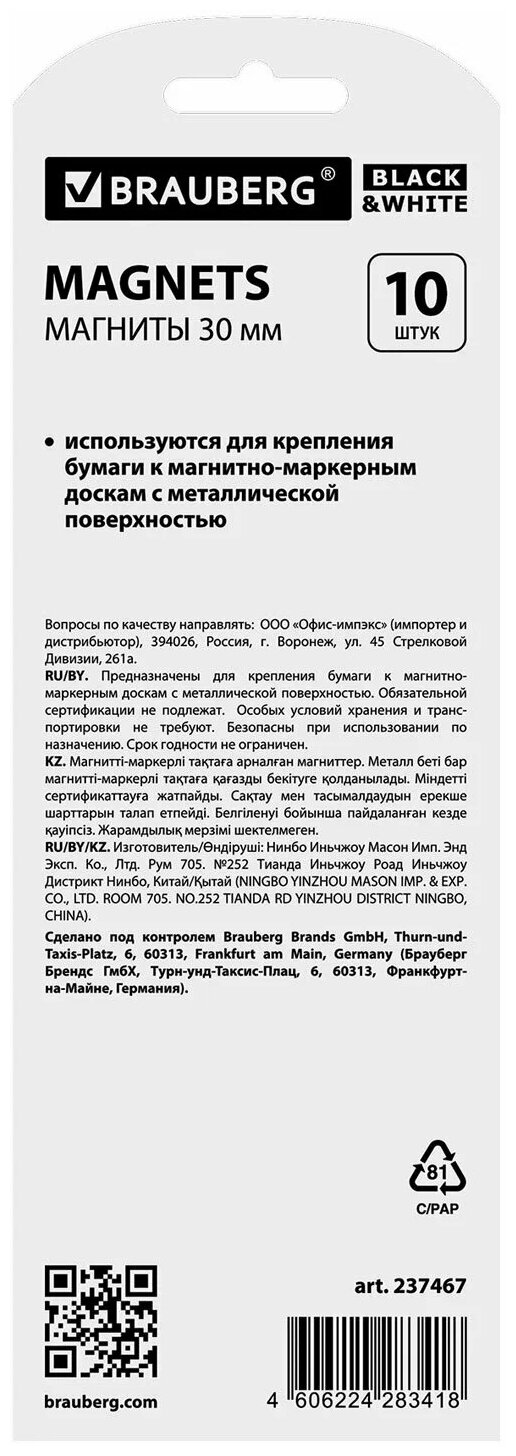 Магниты BRAUBERG "BLACK&WHITE" усиленные 30 мм, набор 10 шт., белые, 237467 В комплекте: 1шт.