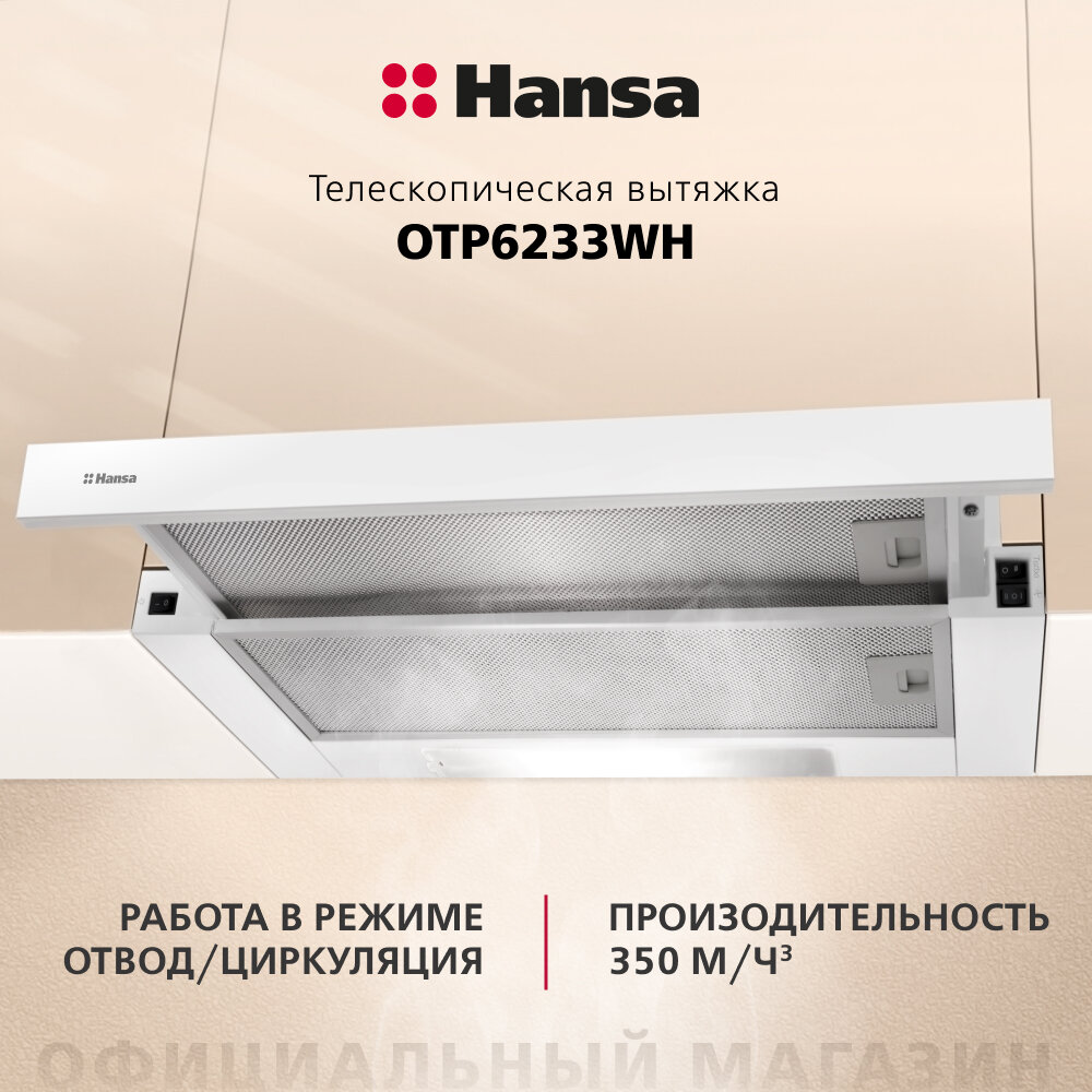 Телескопическая вытяжка Hansa OTP6233WH, 60 см, механическое управление, 3 скорости, режимы отвода и рециркуляции, светодиодная подсветка, белая 6 760 ₽
