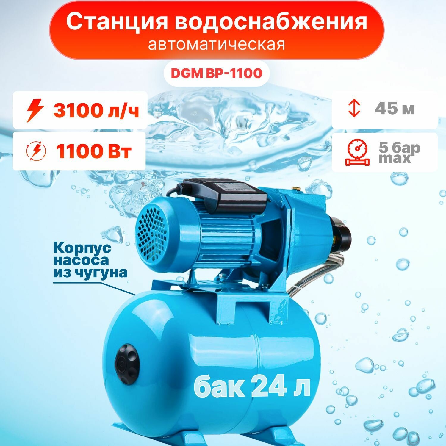 Станция водоснабжения автоматическая DGM BP-1100 (1100 Вт, 3100 л/ч, 45 м, 5 бар макс, корпус насоса чугун, бак 24 л) (BP-1100)