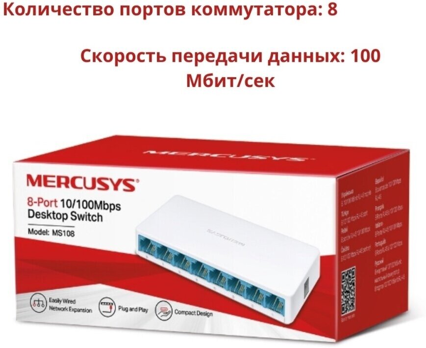 Коммутатор Mercusys MS108, неуправляемый, 8x10/100BASE-TХ информация: