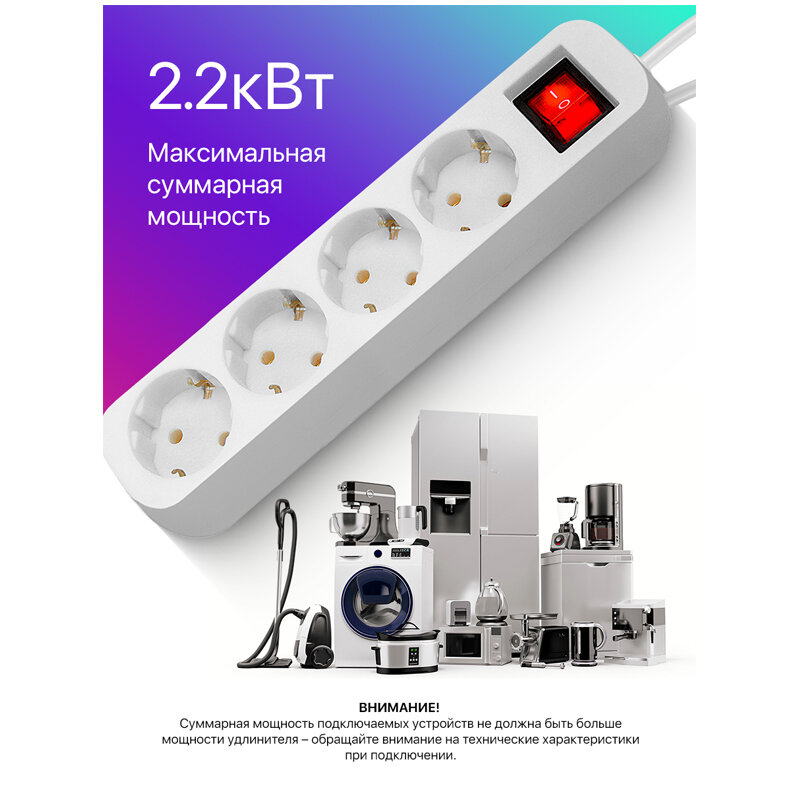 Удлинитель с заземлением Defender S418 Выключатель, 1.8 м, 4 розетки