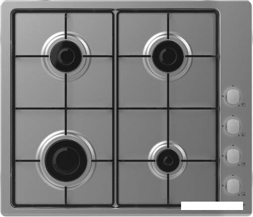 Газовая варочная поверхность 60 см. Цвет: Нерж сталь. Цвет ручек: серебро. Газ-контроль. Автоматический электроподжиг. 4 конфорки: быстрая, 2-е полубыстрые и вспомогательная. 2 эмалированных решетки. Цельноштампованная поверхность. Комплект форсунорк для