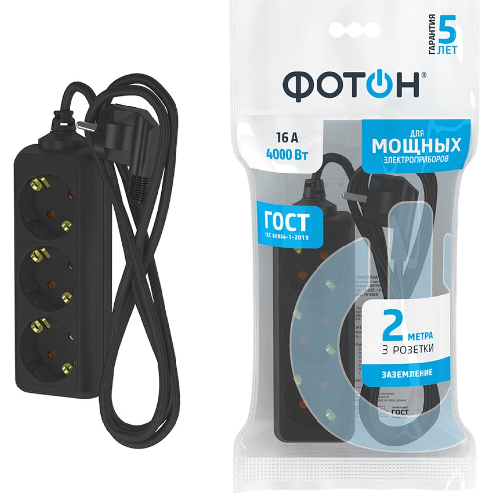 Удлинитель сетевой для розетки фотон 10А 2м 3 розетки черный, ГОСТ информация: