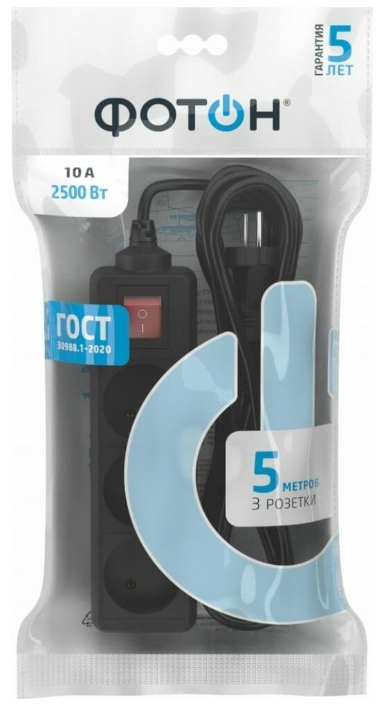 Удлинитель сетевой "фотон" 10-53S, 5 метров, 3 розетки, 10А, с выключателем, Черный, ГОСТ