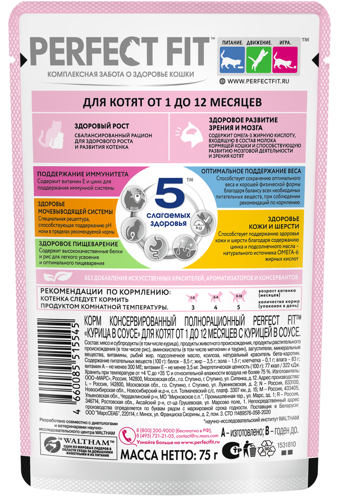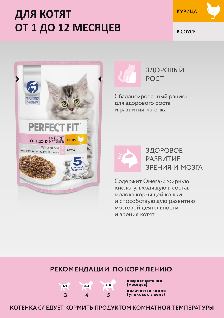Корм консервированный для котят PERFECT FIT с курицей в соусе 1–12 месяцев, 75г информация: