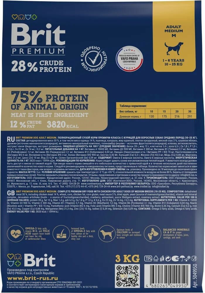 Brit Premium Dog Adult Medium корм сухой для взрослых собак с курицей 1шт - 3кг информация: