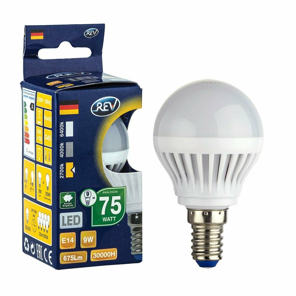 Упаковка светодиодных ламп 3 шт REV 32406 5, 2700К, Е14, G45, 9Вт