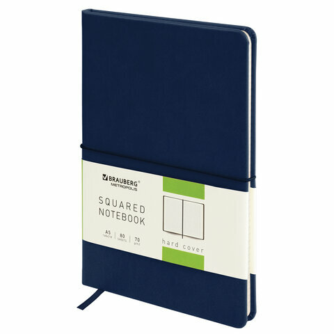 Бизнес-блокнот, записная книжка, тетрадь А5 (148x218 мм), Brauberg Metropolis X, под кожу, 80 л., резинка, клетка, темно-синий, 111031