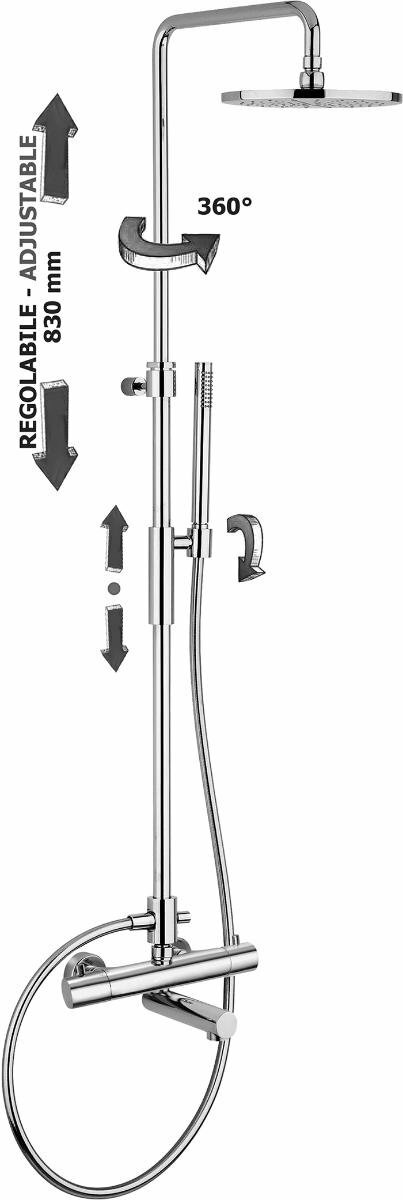 Колонна латунная BIRILLO термостат с изливом,регулируемая, верх.душ MASTER диам.225мм металл, руч. Душ Master из металла , шланг PVC 1500мм, держатель душа круглый подвижный и поворотный, цвет хром ZCOL721LIQCR