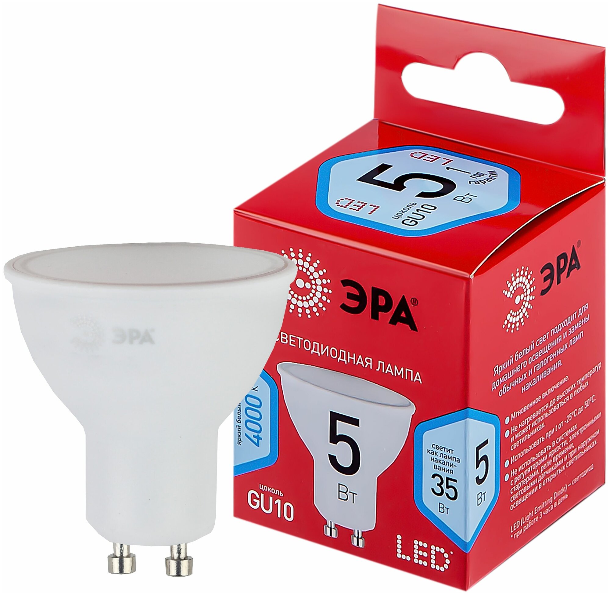 Лампочка светодиодная ЭРА RED LINE GU10 5 Вт софит нейтральный белый свет