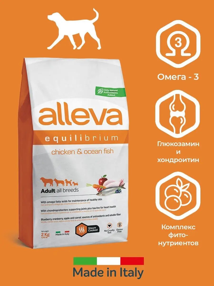 ALLEVA EQUILIBRIUM DOG для собак All Day Maintenance Chicken Ocean Fish All Breeds взрослых с курицей и океанической рыбой 2кг 3032