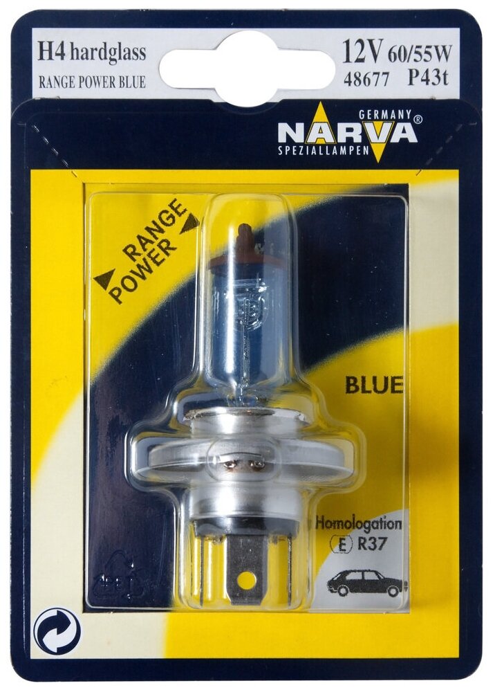 Лампа автомобильная галогенная Narva Range Power Blue+ 48677 H4 12V 60/55W P43t-38 3700K 1 шт.