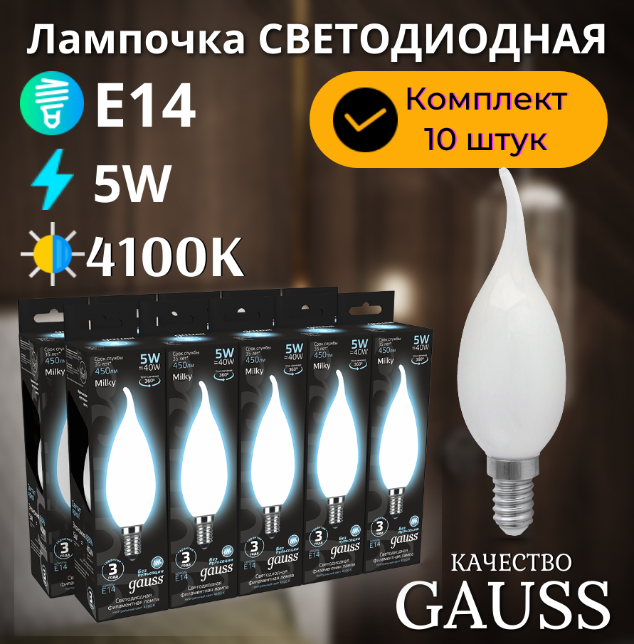 Отзывы на Лампочка светодиодная E14 Свеча на ветру 5W нейтр белый свет 4100К упаковка 10 шт. Gauss Filament