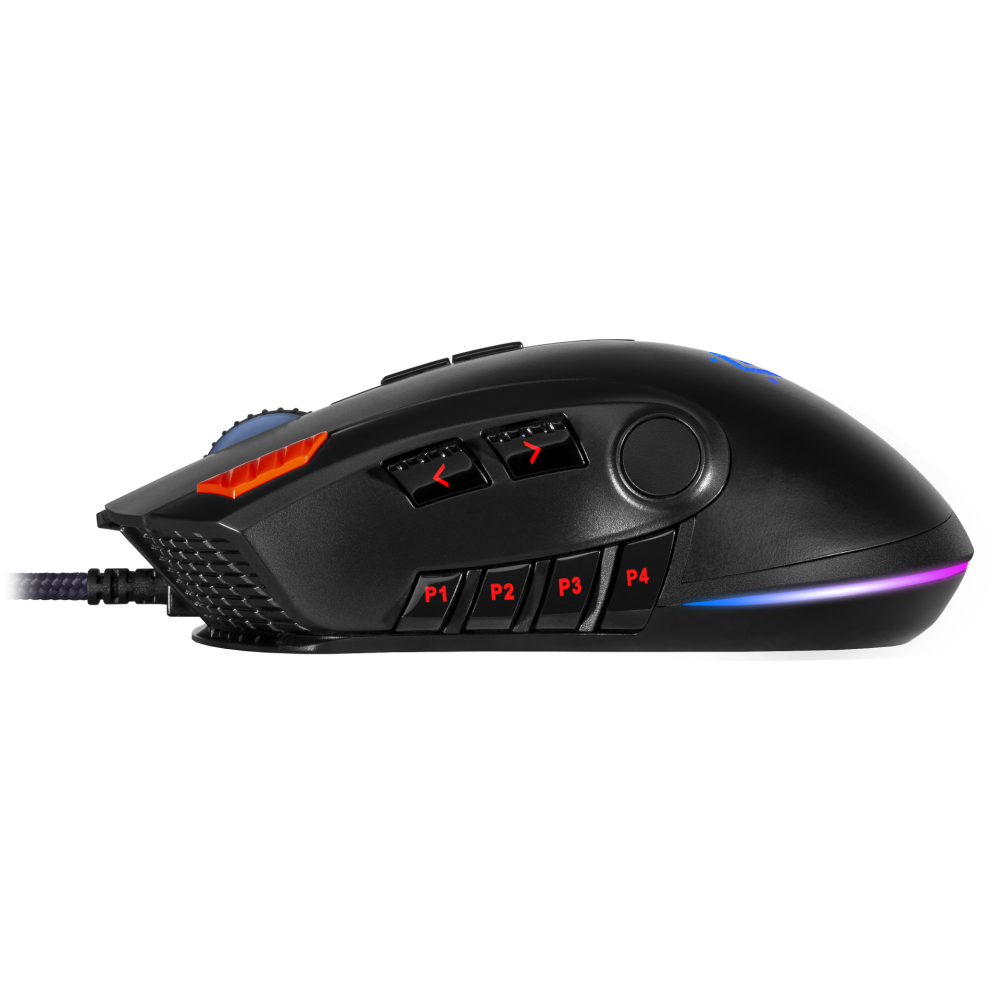 | Дополнительная информация | 6 режимов подсветки, функция FIRE для шутеров, 6 режимов разрешения, грузики для регулировки веса мыши, редактор макросов, эмуляция клавиш, клавиатуры, широкое прорезиненное колесо прокрутки шириной 8 мм с подсветкой, плетеная структура кабеля |