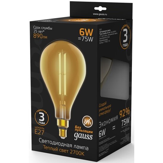 Отзывы на Лампа Gauss Filament PS160 6W 890lm 2700К Е27 golden straight LED 1/6