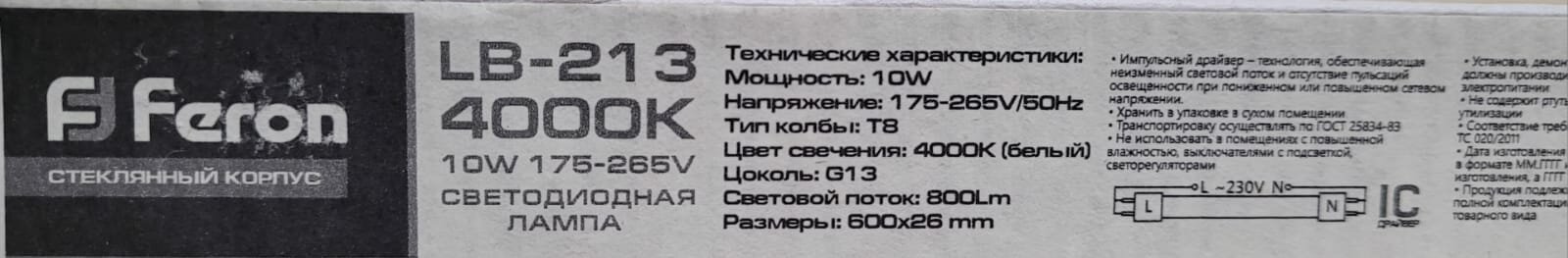 Feron LB-213 25497, G13, T8, 10 Вт, 4000 К информация: