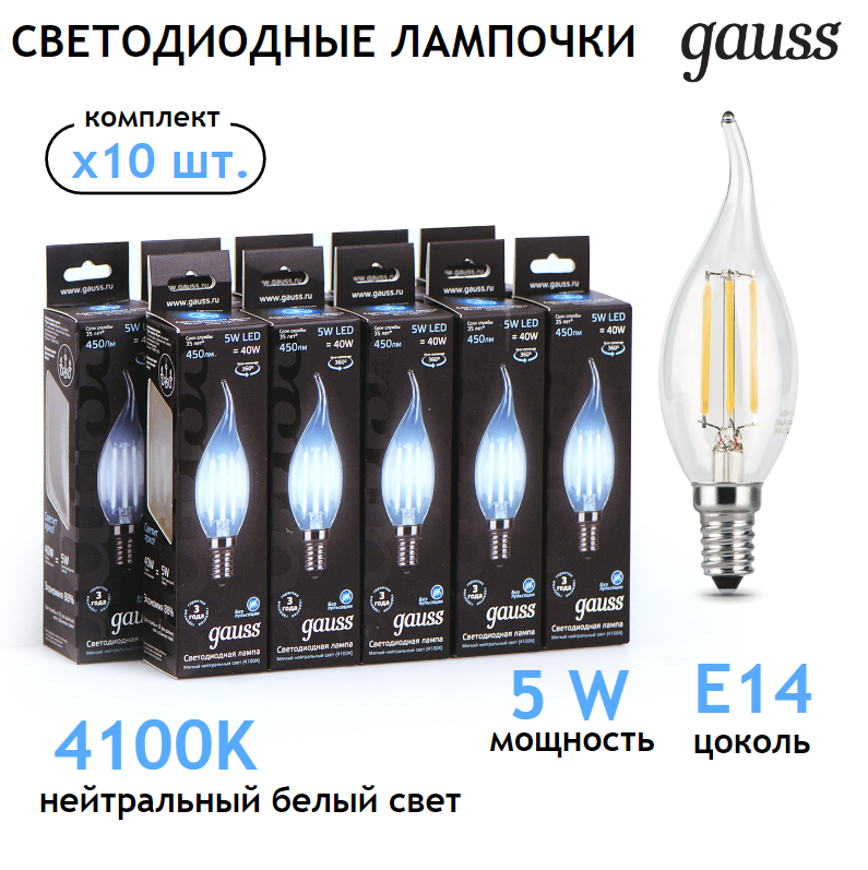 10 цен на Лампа филам. Gauss Filament 5Вт цок.E14 свеча 220B 4100K св.свеч.бел.ней. упак.10шт 104801205