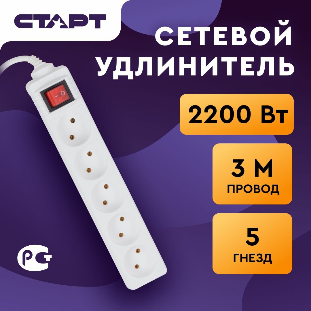 10 цен на Удлинитель сетевой бытовой 5м старт 3 розетки с выключателем, 10А, ПВС 2х0.75, 2200 Вт