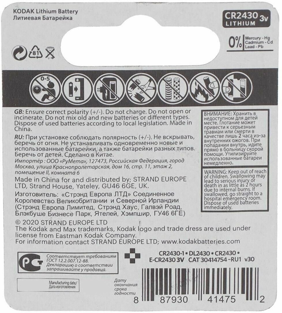 Батарейки литиевая Kodak Max, CR2430-1BL, 3В, блистер, 1 шт. информация: