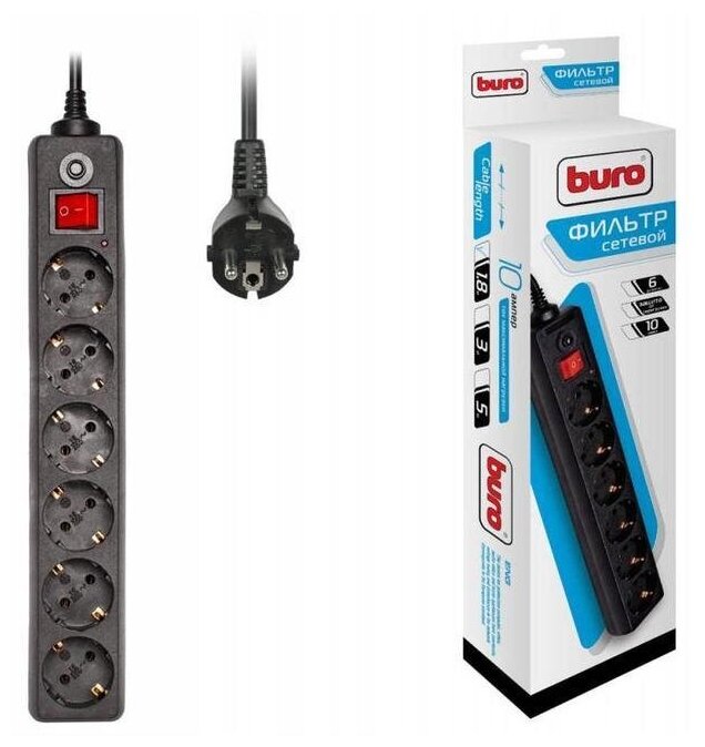 Сетевой фильтр Buro Черный, 600SH, 1,8 м, 6 розеток
