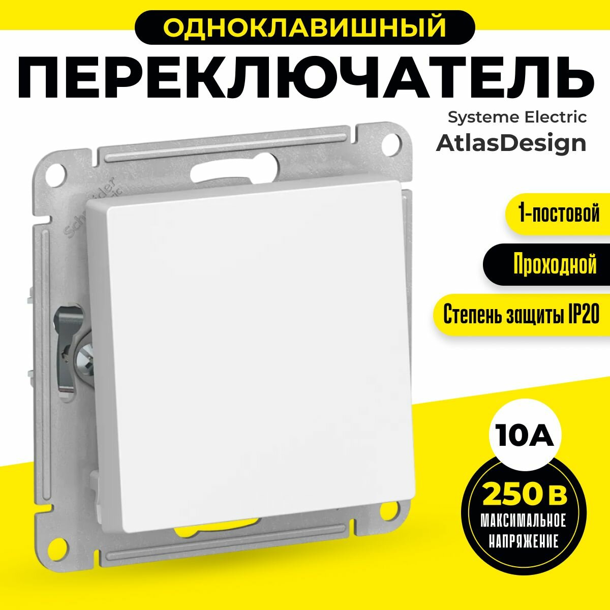 Переключатель 1-клавишный белый, сх.6, 10АХ, механизм Schneider Electric AtlasDesign (комплект 4шт)